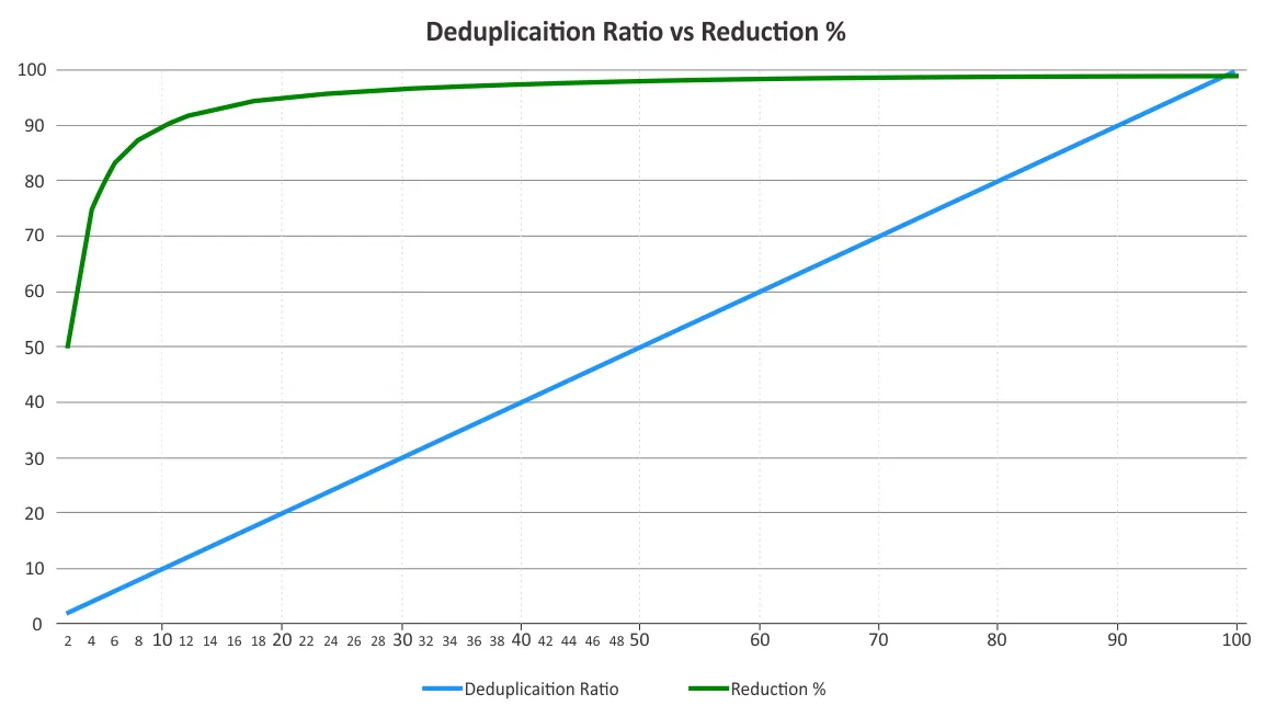 You should determine the deduplication ratio and storage space reduction. These two parameters are sometimes confused. Deduplication ratios don’t change proportionally to data reduction benefits as the law of diminishing returns is bound to come into play beyond a certain point. See the graph below.