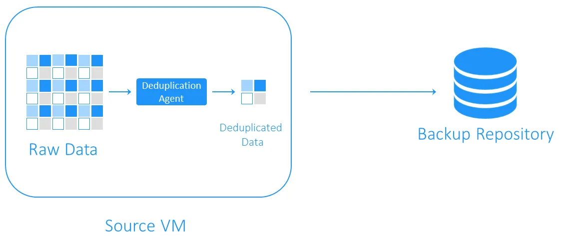 Source-side deduplication decreases network load because less data is transferred during the backup. However, it requires a deduplication agent to be installed on each VM or on each host. The other drawback is that source-side deduplication may slow down VMs due to calculations required for the identification of duplicate data blocks.