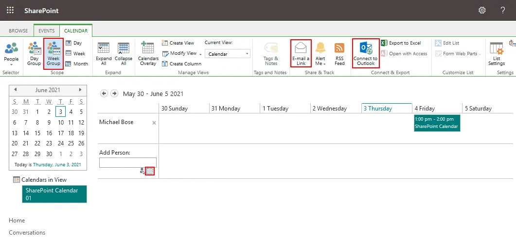 - On the screenshot below you see a calendar that is available for a group of users. Users can edit this calendar and add, edit, and delete events. Let’s select the Week Group for the SharePoint calendar view, send an email notification for other users who are added to this SharePoint calendar, and connect the calendar to Outlook. Click the Calendar tab to display a ribbon with options. In order to add users or groups to this calendar, click the notepad icon near the Add Person field.