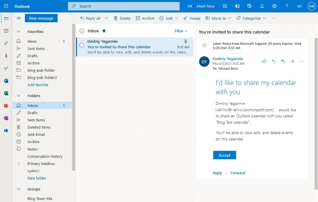 - A calendar is now shared with the selected users (Michael Bose in my case). Log in to Office 365 as a user with whom you shared a calendar. I’m logging in to Office 365 as Michael Bose now. After opening Outlook Online, I see the invitation message to open a shared calendar. Click Accept to add a shared calendar to your calendars in Office 365.