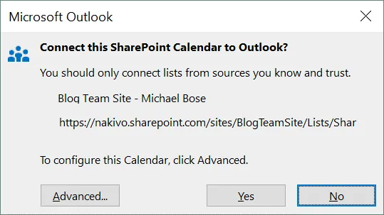 - If you want to add this SharePoint calendar to Microsoft Outlook that is installed as a standalone email client in your Windows operating system, click Connect to Outlook in the SharePoint calendar view in a web browser. A confirmation message is displayed in your web browser, and you have to select the email application to which you want to add this calendar, for example, Microsoft Outlook.