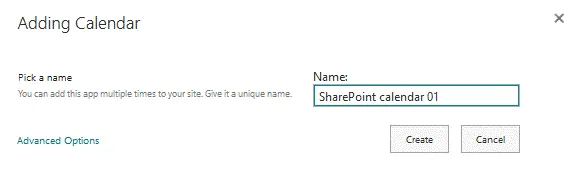 - After you click the Calendar app, the Adding Calendar window is displayed in the web interface. Enter a name for your calendar, for example, “SharePoint calendar 01” and click Advanced options to edit more options.