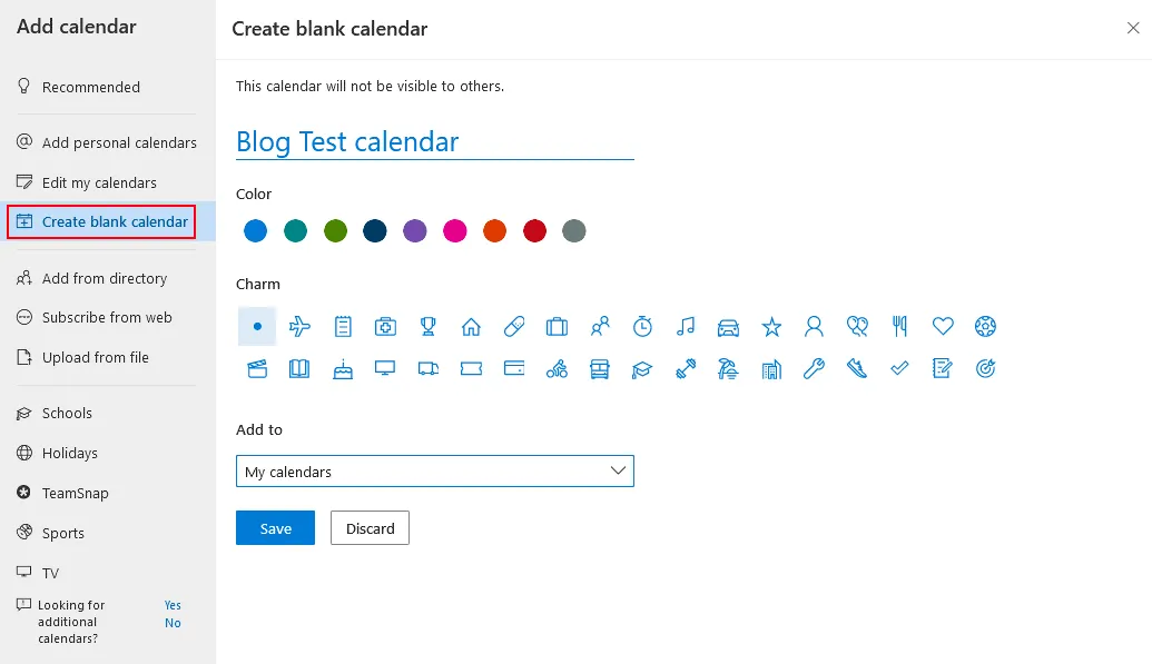 - Click Create a blank calendar on the Add calendar page. Enter a calendar name, for example, Blog Test calendar. Select color and charm if you want, then select location (a folder) to store the calendar in the drop-down menu (My calendars is selected in my case). Click Save to save settings and create a calendar.