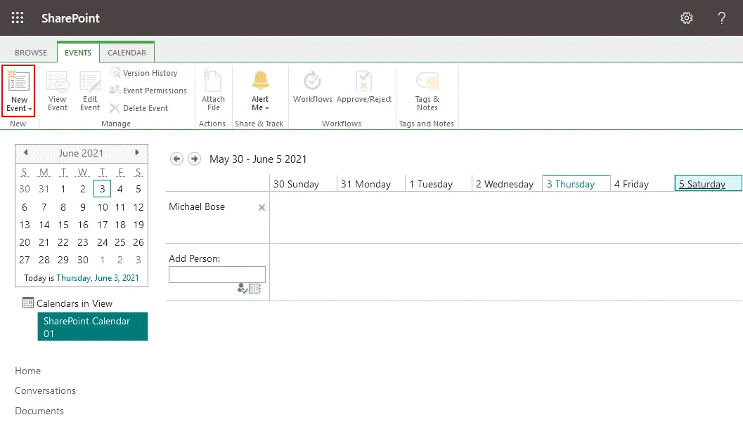 - Click the Events tab to display a ribbon with options, click New Event to create a new event in the calendar.