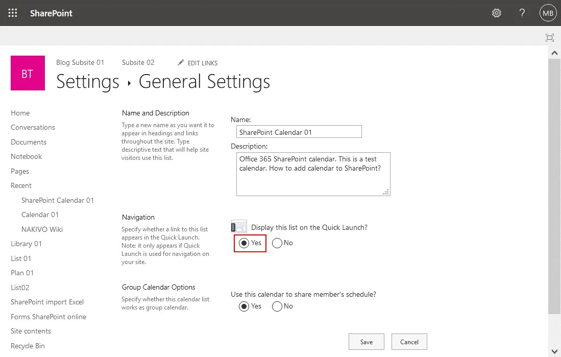 Display this list on the Quick Launch? Select Yes. - Click Save to save settings for this SharePoint calendar.