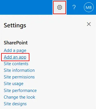 - Another way to add an app is to click the Settings icon in the top right corner of the web interface and in the menu that opens, click Add an app.