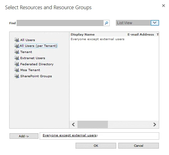 - Select the needed Office 365 users. We select All Users (per Tenant) to add everyone except external users. You cannot add the external email addresses of users. Then click Add and OK.