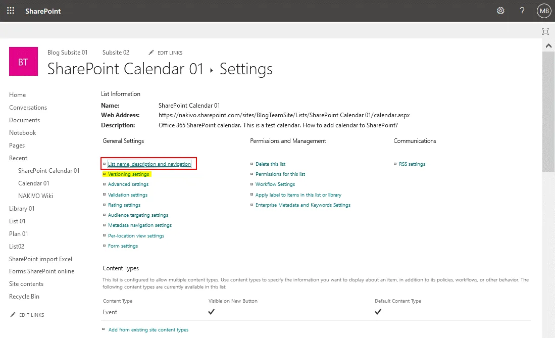- Click List name, description, and navigation on the calendar settings page. A SharePoint calendar is based on a SharePoint list, that’s why this settings page has this name. Rows are used for events and columns are used for metadata such as location, event title, start date, end date, etc.