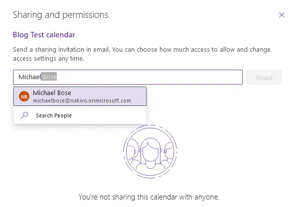 - Once you begin to enter names, auto-filling suggests available users, displayed below in a list. In my example, I’m sharing the calendar with Michael Bose. You can select multiple users and groups.