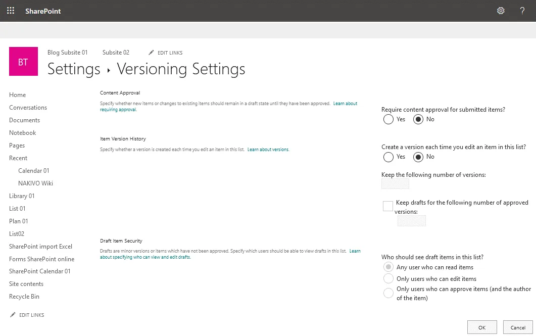 You can open versioning settings from the calendar (list) settings page and enable versioning. Versioning allows you to restore a previous version of a SharePoint calendar if unwanted changes have been made to the calendar. By default, versioning is disabled.