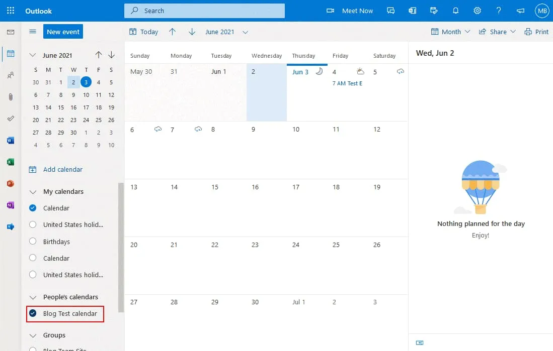 The Blog Test calendar is now added to Michael Bose’s account and is displayed in the left pane of the Outlook Calendar page (https://outlook.office.com/calendar/view/month).