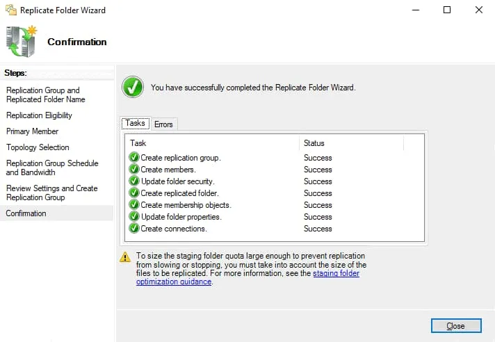 View the DFS replication configuration status on the Confirmation screen. You should see the Success status for all tasks as displayed on the screenshot below. Click Close to close the wizard window.