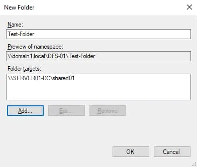 - In the New Folder window, enter a folder name, for example, Test-Folder to link the DFS folder and a shared folder created before. Click Add.