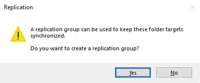 A replication group can be used to keep these folder targets synchronized. Do you want to create a replication group?