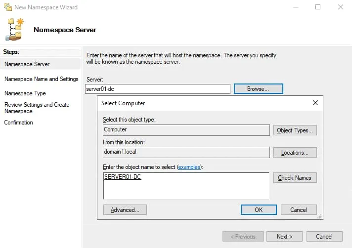 - Namespace Server. Enter a server name. If you are not sure that the name is correct, click Browse, enter a server name and click Check Names. In this example, we enter the name of our domain controller (server01-dc). Click Next at each step of the wizard to continue.
