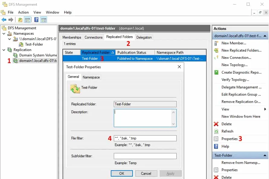 - Expand the Replication tree in the navigation pane and select the needed DFS replication group folder name (domain1.local\dfs-01\Test-folder in our case).