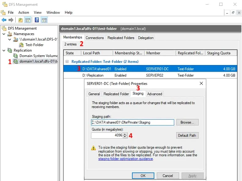 Another aspect of configuring staging folders is performance optimization. DFS replication can consume additional CPU and disk resources, slow down and even stop if the staging quota is too small for your tasks. The recommended size of the staging quota is equal to the size of the 32 largest files in the replication folder.