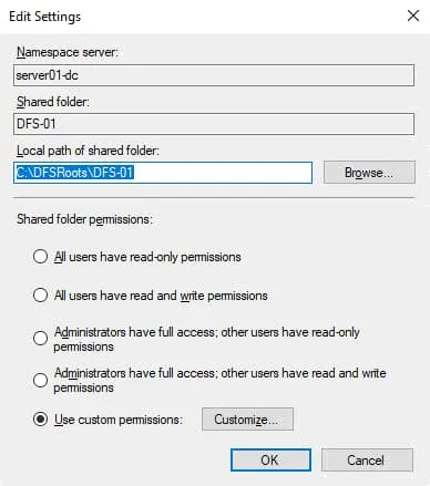 Pay attention to the local path of a shared folder. Change this path if needed. We use the default path in our example (C:\DFSRoots\DFS-01).