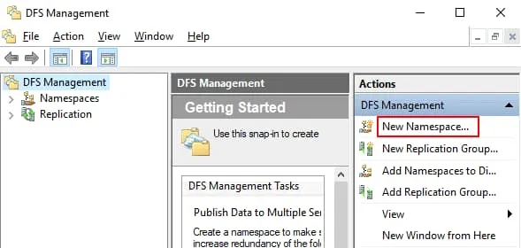 - Open the DFS management window by running dfsmgmt.msc as we did before. Perform the following actions in the DFS management window.