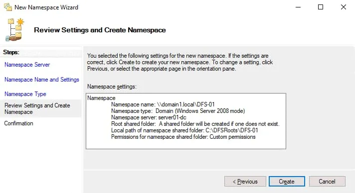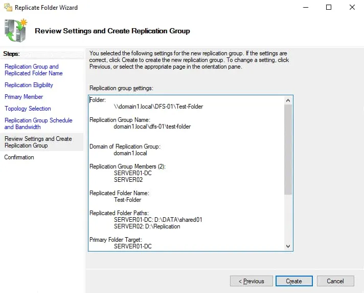 Review settings for your DFS replication group. If everything is correct, click Create.
