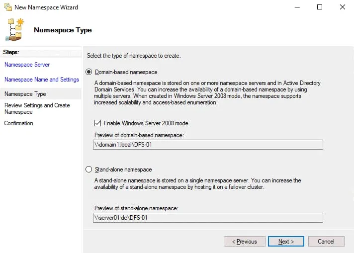 - Namespace type. Select the type of namespace to create. We select Domain-based namespace and select the Enable Windows Server 2008 mode checkbox. Select this checkbox if the functional level of your domain is Windows Server 2008 when you use Windows Server 2016 or Windows Server 2019 for better compatibility.