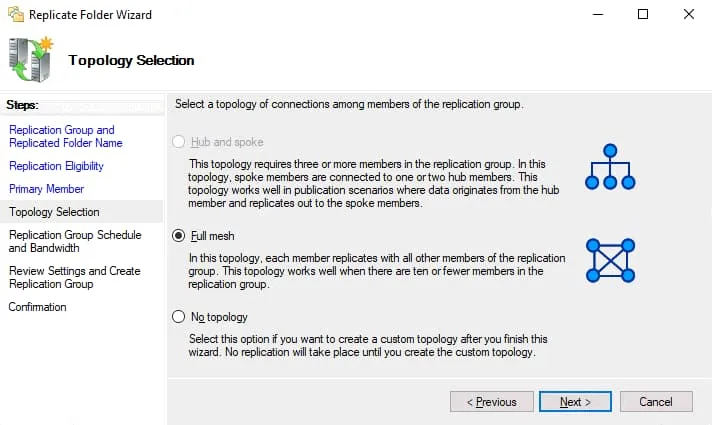 Full mesh is the recommended option when using a DFS replication group with less than ten servers. We use Full mesh to replicate changes made on one server to other servers.