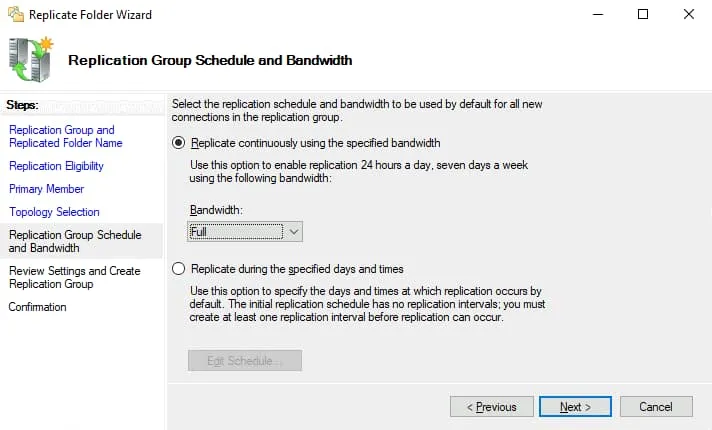 - Replicate continuously using the specified bandwidth. Replication is performed as soon as possible. You can allocate bandwidth. Continuous replication of data that changes extensively can consume a lot of network bandwidth. To avoid a negative impact on other processes using the network, you can limit bandwidth for DFS replication. Keep in mind that hard disk load can be high.