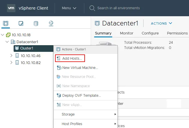 - Once the cluster object is added, we can add ESXi hosts to the cluster object. Right-click the cluster name in VMware vSphere Client and click Add Hosts in the menu that opens. Once we add a host to the cluster, the host’s resources become part of the cluster resources. The cluster manages the resources of all hosts.