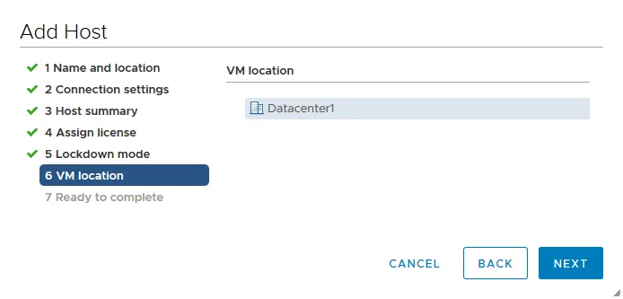 - Name and location. Enter the IP address of an ESXi host you want to add to the selected datacenter. Click Next at each step to continue.