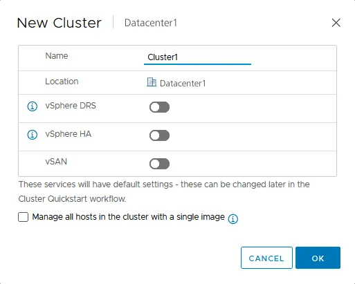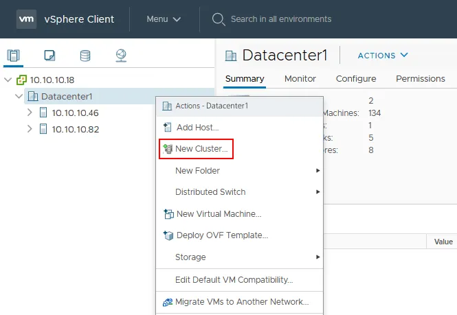 Once the datacenter is created and ESXi hosts are added, you can choose to create a new vSphere cluster.