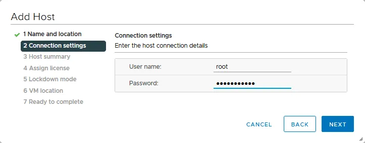 - Connection settings. Enter the administrative credentials of the ESXi host you’re adding.