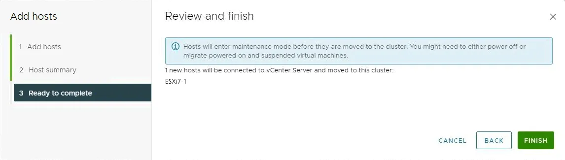 - Ready to complete. Finally, we are ready to add the host to the datacenter. We will continue this process for all the hosts we wish to join to the vSphere cluster. Click Finish.