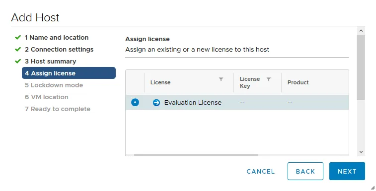 - Assign license. We have the option to select the license we want to use on the host. You can read more VMware vSphere licensing. You can simply choose the evaluation license to continue with the trial license, which is good for 60 days. Note that there are limitations in Free ESXi, and you cannot use the free version to build an ESXi cluster.