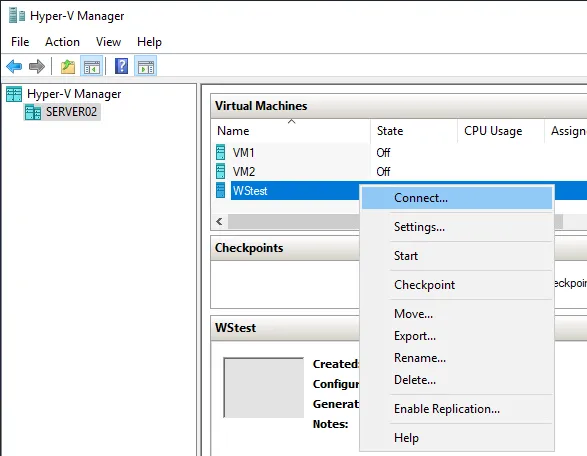 Start by using Hyper-V Manager to connect to the Hyper-V host. Hyper-V Manager is included in Remote Server Administration Tools (RSAT) for client operating systems such as Windows 10 or included in the Server Manager “install features” section of Windows Server 2016 and 2019. Note that RSAT is a separate download.