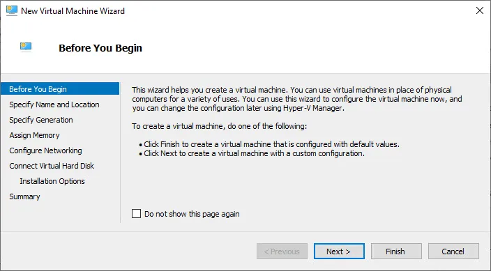 - Before you begin. Read the wizard introduction if you want and click Next. You can select the checkbox not to show this page again when you create a new virtual machine in Hyper-V.