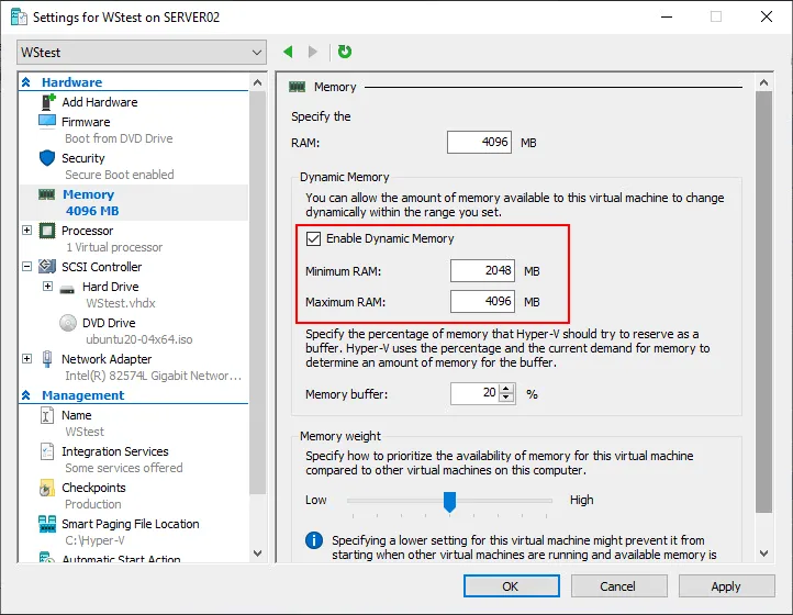 - Assign Memory. Memory management in Hyper-V has an option called Dynamic Memory. You can see the checkbox that can be selected to enable the feature at this stage. If you choose to enable this option, Hyper-V cooperates with the VM guest operating system in managing guest operating system memory.