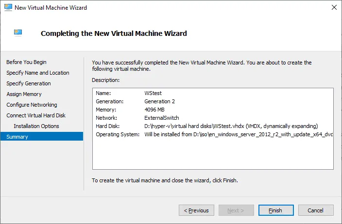 - Check the configuration Summary. The displayed information allows you to ensure that your configuration is correct. If something is incorrect, you can go back and modify the settings. Once you click Finish, your Windows Server VM is created according to your specified virtual machine configuration.
