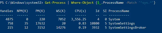 Get-Process | Where-Object {$_.ProcessName -Match "^sys.*"}