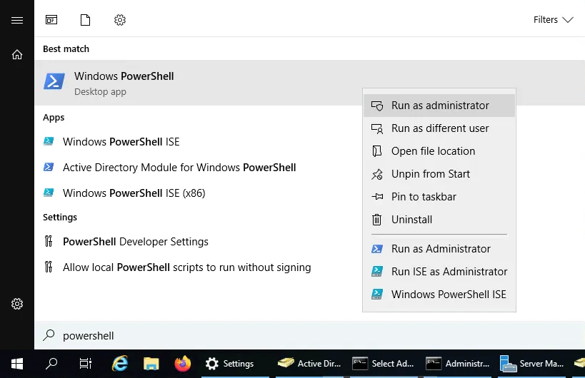 - Right-click the PowerShell icon and select Run as Administrator to open PowerShell in elevated mode.