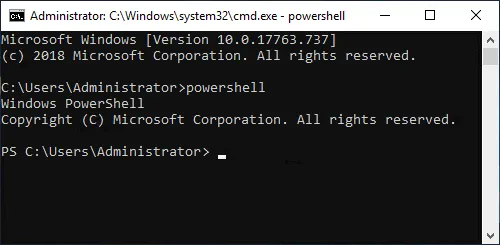 Once there, you are in a regular cmd.exe environment – not PowerShell. To launch a PowerShell environment, simply type powershell in the command line.