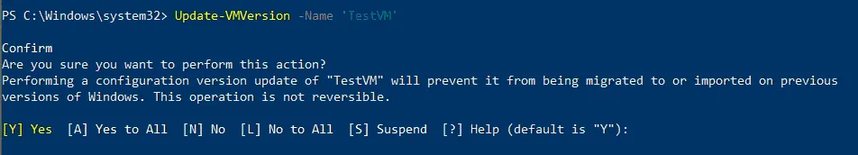 After running the Hyper-V PowerShell command, the VM named TestVM can be updated to the current VM version.