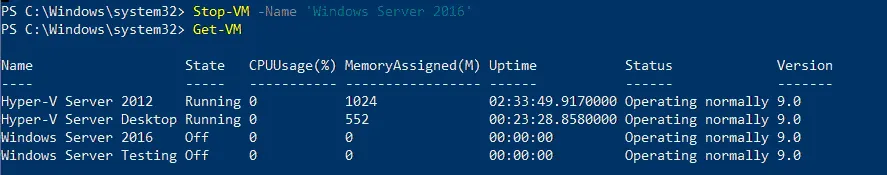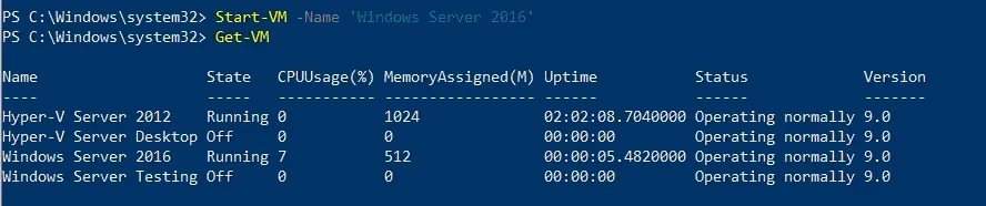 As a result, the VM named Windows Server 2016 is started on your local Hyper-V host. Let’s check to see if the VM has actually started by running the Get-VM cmdlet.