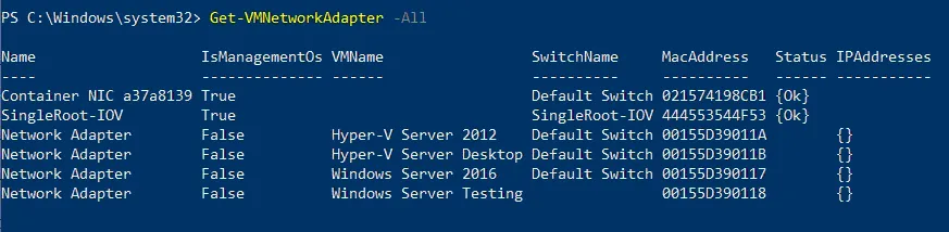 Another helpful PowerShell cmdlet is Get-VMNetworkAdapter, which allows you to identify the virtual network adapters of the selected VM. For example, if you want to find virtual network adapters from all VMs as well as the management OS, you should run the following Hyper-V PowerShell command: