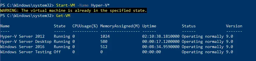 As you can see, the VM named Hyper-V Server Desktop has successfully started. However, another VM (Hyper-V Server 2012) has already been in a running state and PowerShell notifies you of this.