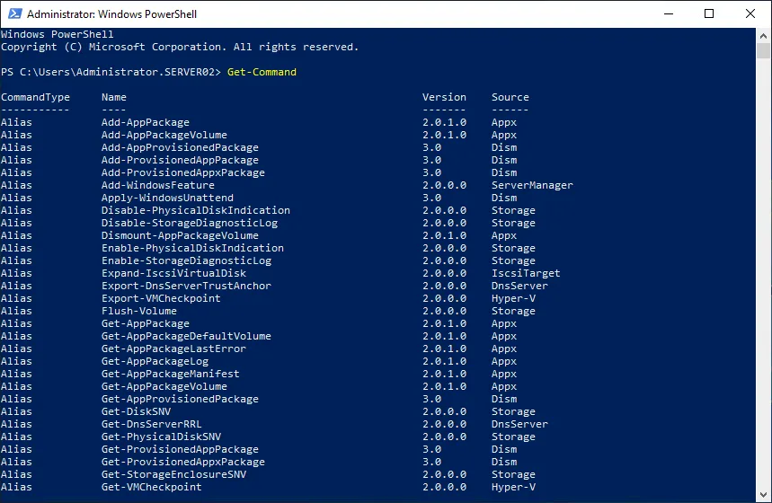 Let’s start with a Hyper-V PowerShell command that is helpful for users who are new to PowerShell and don’t know which cmdlets should be used and how. By running the Get-Command cmdlet, you can see the full list of all available cmdlets (Windows PowerShell commands), functions, and aliases installed on the computer.