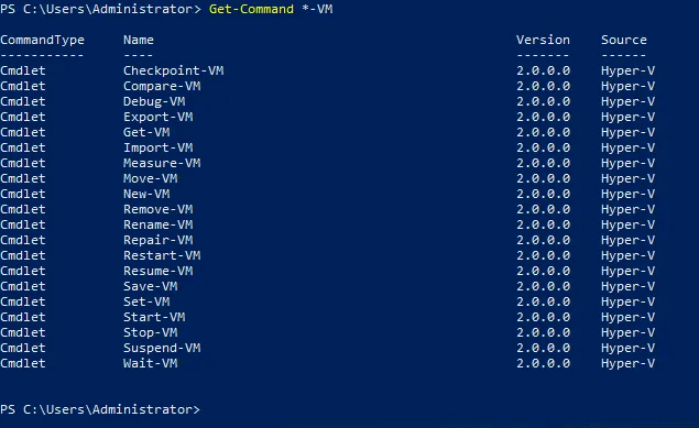 However, if you wish to narrow down your search and get the list of Hyper-V PowerShell commands that match specific criteria, you can use the Get-Command *-VM cmdlet to find the list of commands that allow you to control and configure VMs.