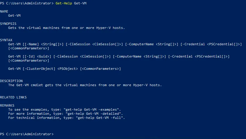 Once you have decided which Hyper-V PowerShell command you want to use, you can learn more about that cmdlet. For this purpose, you can use the Get-Help cmdlet. For example, to find out more about the Get-VM cmdlet, type the following: