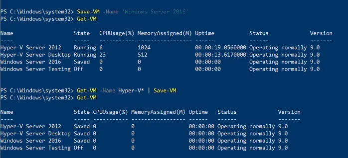 If you want to save the VMs whose names start with Hyper-V, run the following Hyper-V PowerShell command: