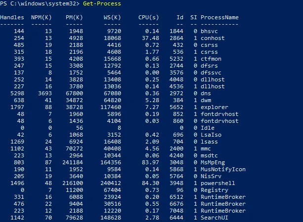 This Hyper-V PowerShell command can help you see all the current processes on your local computer. After running the Get-Process cmdlet, you can get the following information on your screen: