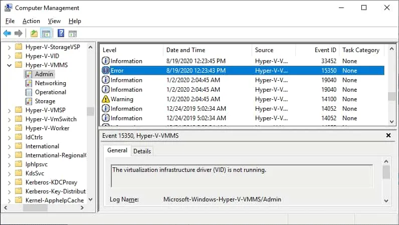 To view logs, open Computer Management and go to System Tools > Event viewer > Applications and services > Microsoft > Windows > Hyper-V VMMS.